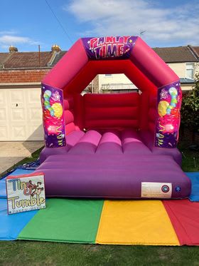This is our 11x15 pink party time bouncy castle which is a great hit with the children. Its one of our generic themes and is great when booked with one of our soft play packages! Given its size it will fit in most halls and gardens however please measure first to ensure it will fit. The castle has a height of 9ft so please ensure ceilings are over 9.5ft. This party time bouncy castle is only suitable for children.