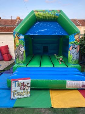 This is our 11x15 Jungle bouncy castle which is a great hit with the children. It features the iconic Jungle graphic and is great when booked with one of our Jungle soft play packages! Given its size it will fit in most halls and gardens however please measure first to ensure it will fit. The castle has a height of 9.5ft so please ensure ceilings are over 10ft. This bouncy castle is only suitable for children.