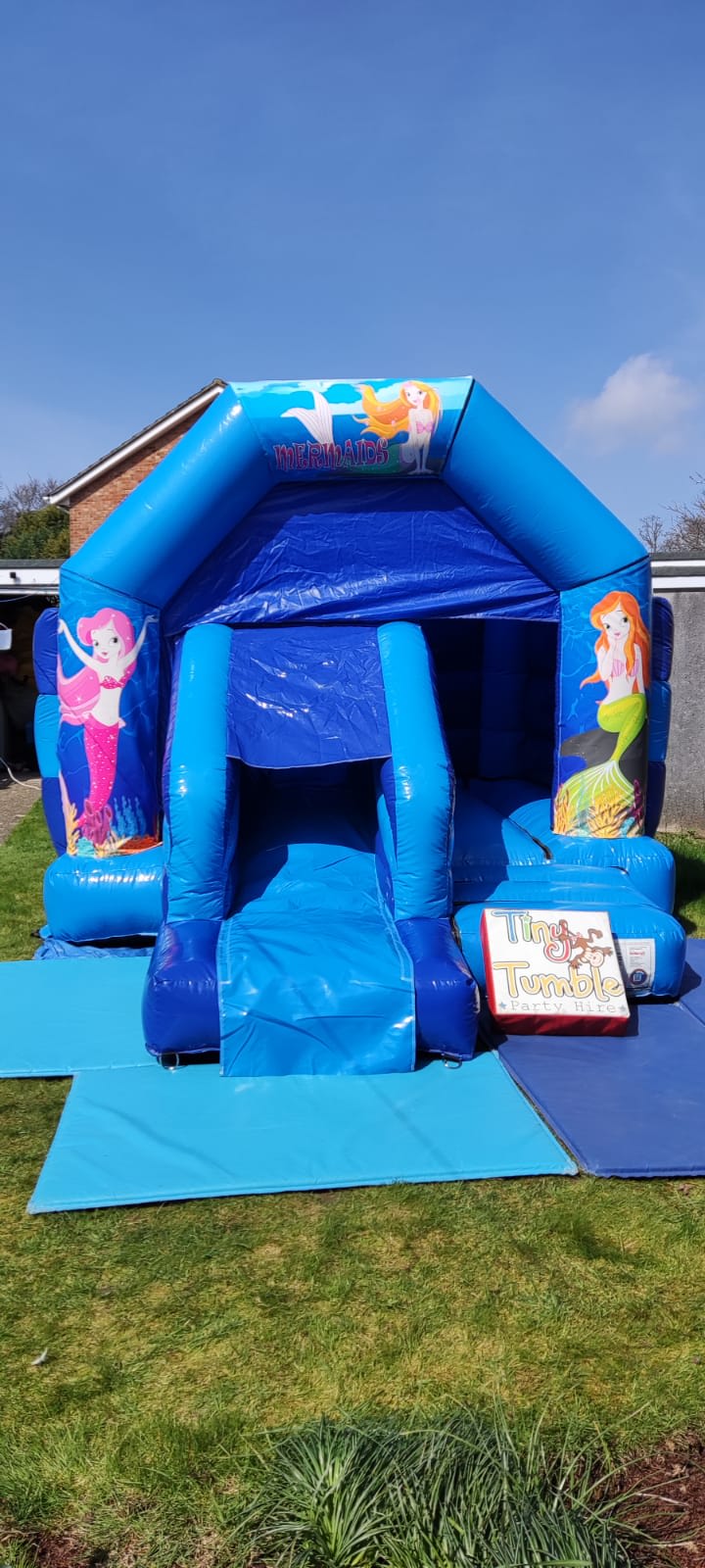 This is our 11x16 bouncy castle with slide which is a great hit with the children. It features the iconic Mermaid graphic and is great when booked with one of our soft play packages! This castle has added fun with its front slide! Given its size it will fit in most halls and gardens however please measure first to ensure it will fit. The castle has a height of 9.5ft so please ensure ceilings are over 10ft. This bouncy castle is only suitable for children.