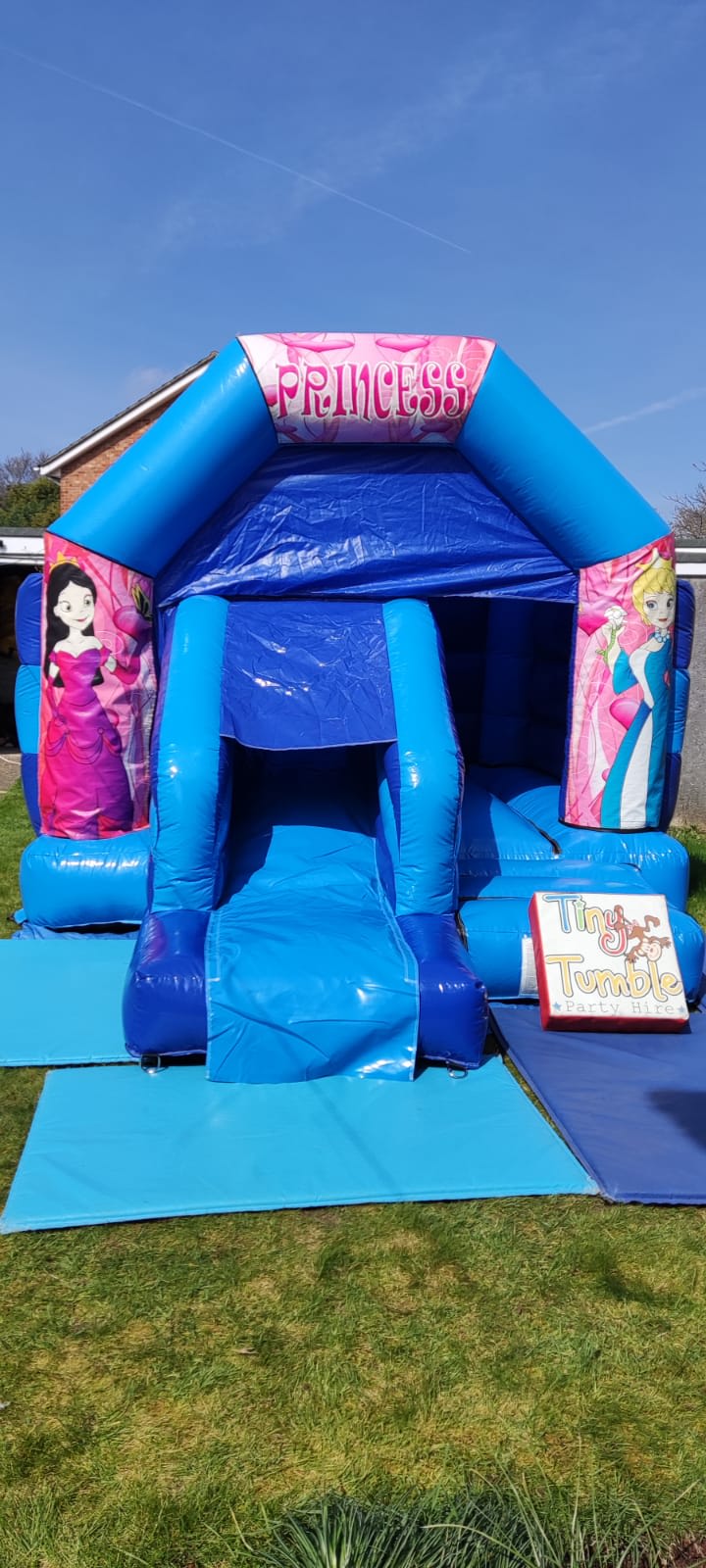 This is our 11x16 bouncy castle with slide which is a great hit with the children. It features the iconic Princess graphic and is great when booked with one of our soft play packages! This castle has added fun with its front slide! Given its size it will fit in most halls and gardens however please measure first to ensure it will fit. The castle has a height of 9.5ft so please ensure ceilings are over 10ft. This bouncy castle is only suitable for children.