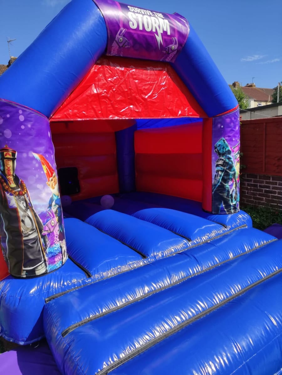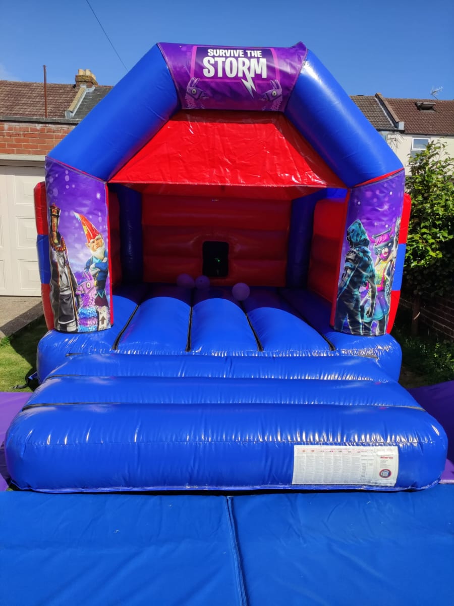This is our 11x15 Fortnite bouncy castle which is a great hit with the children. Given its size it will fit in most halls and gardens however please measure first to ensure it will fit. This castle has a height of 9ft so please ensure ceilings are over 9.5ft. This bouncy castle is only suitable for children.
