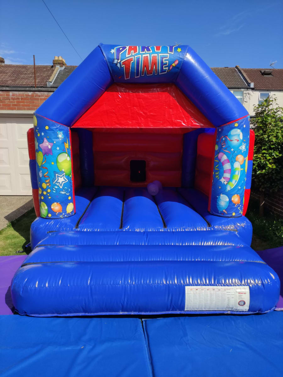 This is our 11x15 party time bouncy castle which is a great hit with the children. Its one of our generic themes and is great when booked with one of our soft play packages! Given its size it will fit in most halls and gardens however please measure first to ensure it will fit. The castle has a height of 9ft so please ensure ceilings are over 9.5ft. This party time bouncy castle is only suitable for children.