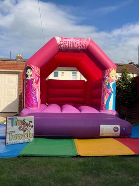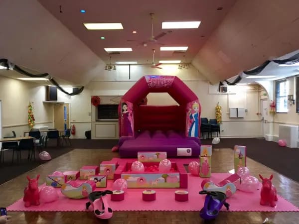 This is our 11x15 pink princess bouncy castle which is a great hit with the children. It features beautiful princesses on, fit for any princess party and is great when booked with our princess soft play package creating the ultimate princess extravaganza! Given its size it will fit in most halls and gardens however please measure first to ensure it will fit. This castle has a height of 9ft so please ensure ceilings are over 9.5ft. The princess bouncy castle is only suitable for children.