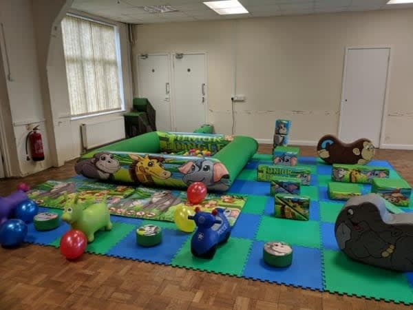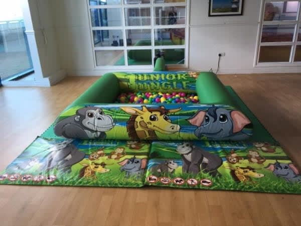 This is our vibrant jungle soft play which is a great hit with the children. It features colourful artworks featuring many of the popular jungle animals and is great when booked with our 11x8 junior jungle bouncy castle creating the ultimate jungle extravaganza! This jungle soft play includes the matted area ( which can be varied in size depending on the space you give us) the HUGE inflatable ball pool with a HUGE amount of balls, selection of jungle soft play, x2 sit on animals and x2 ride ons. Please measure first to ensure it will fit. The jungle soft play is only suitable for children. This jungle soft play is available for hire in Portsmouth, Fareham, Gosport, Lee on solent, Havant, Waterlooville, Denmead, Emsworth, Hayling Island, Petersfield, Eastleigh and many other areas along the south coast so please contact us for more details or check our live delivery on the website.