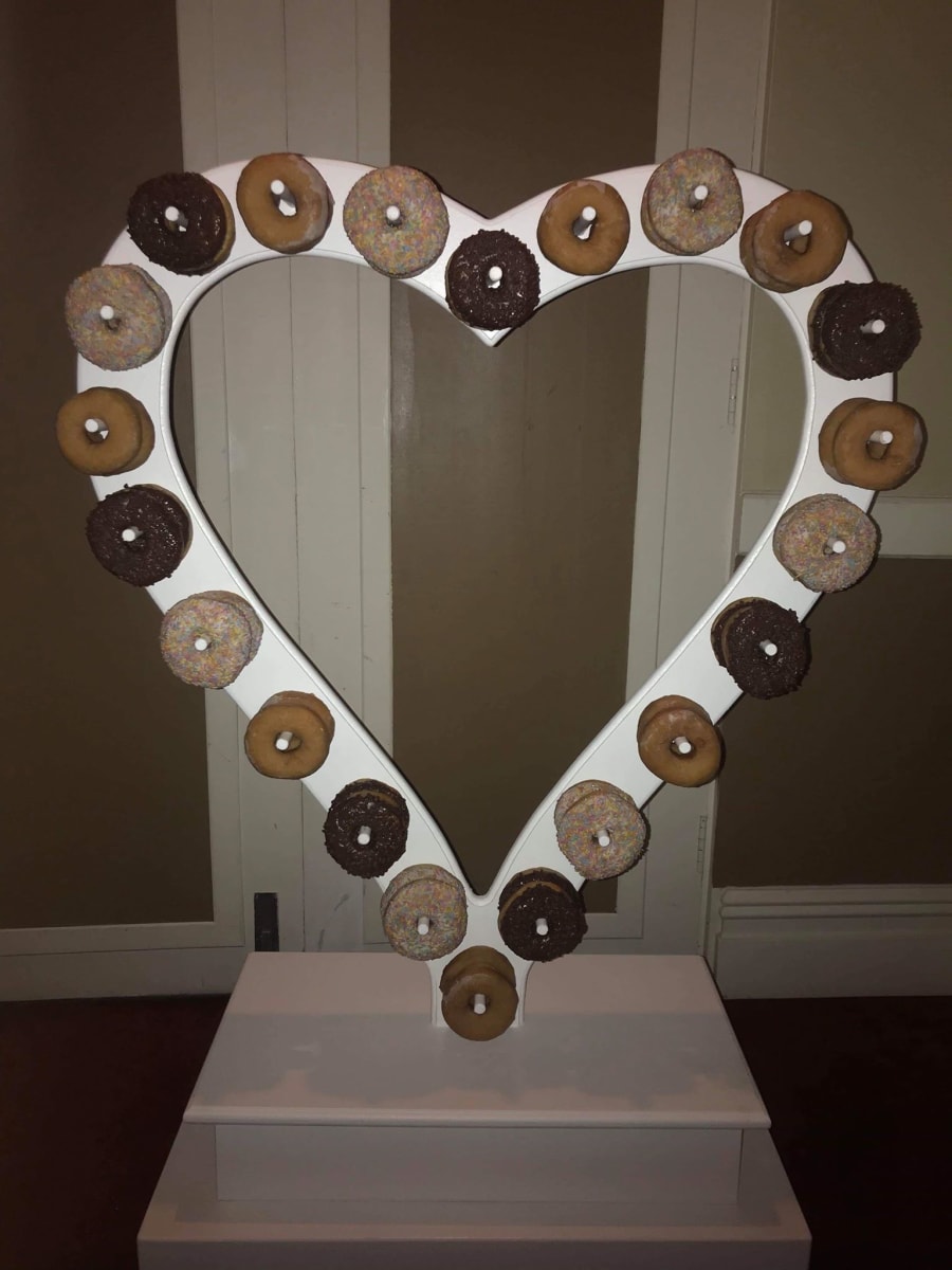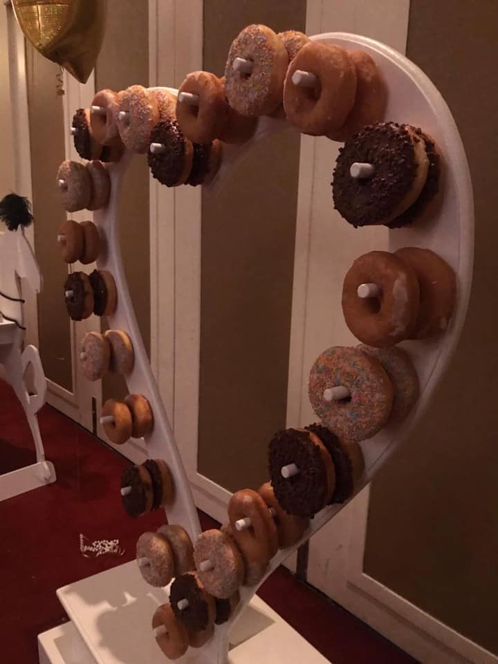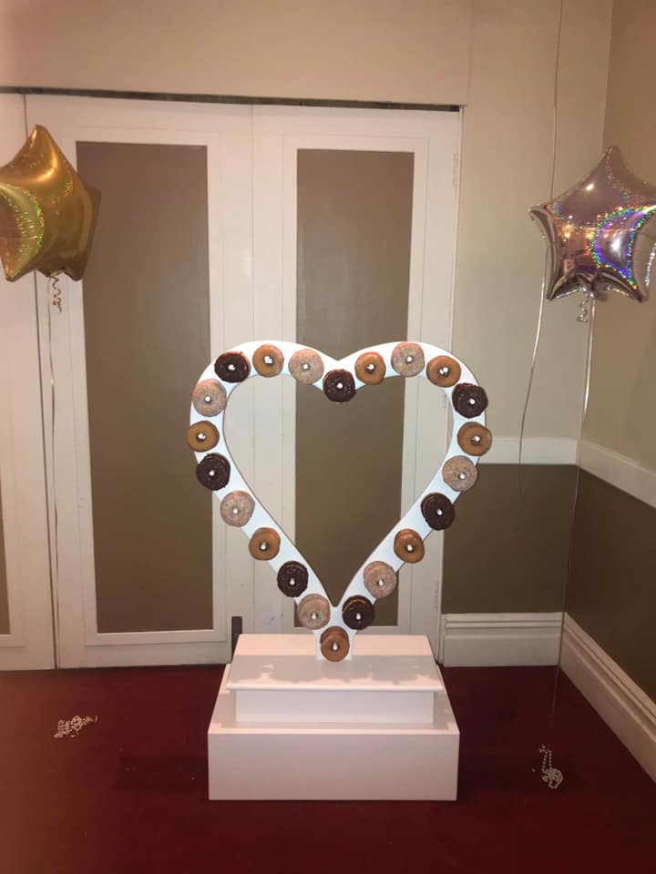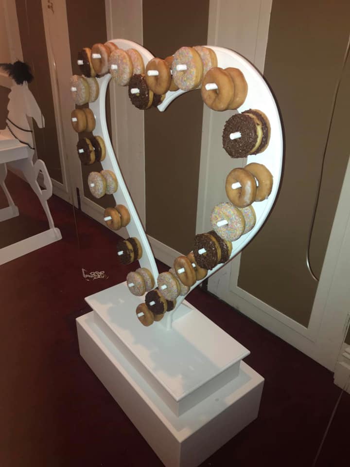 Our fabulous Donut Heart is a crowd pleaser at any event. Our Heart can hold 44 Donuts with two donuts on each peg. This unit can be hired with or without additional donuts.